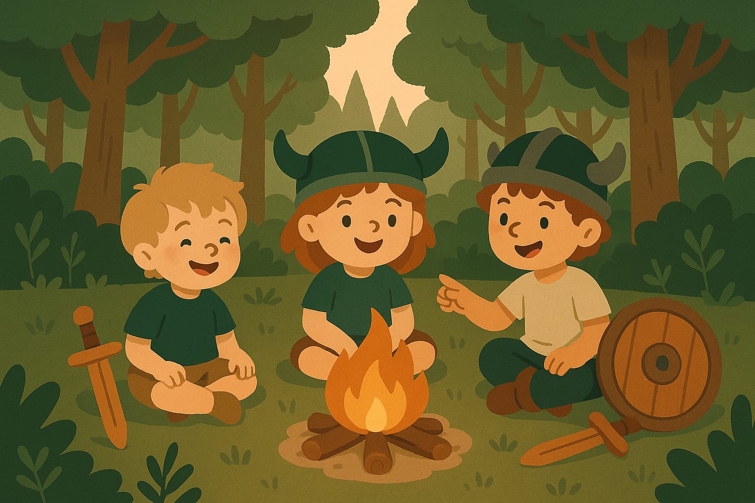 Een kleine viking met zijn houten zwaard, en een dapper vikingmeisje met haar schild van eikenhout, trekken samen op avontuur.